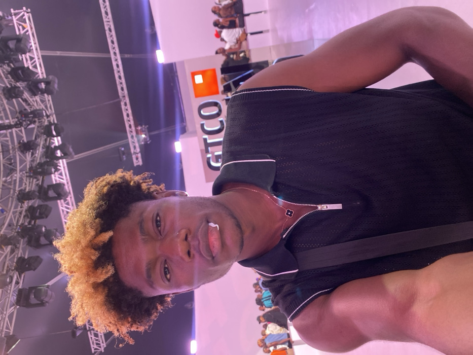 A young Black male is centered in a selfie, taken indoors at an event space in Itirin, Nigeria. He possesses dark, curly hair with lighter, coppery-blonde tips. His expression is neutral, and a small, white, irregular object is visible adhering to the inner aspect of his lower lip on the right side of his mouth. He wears a black, sleeveless collared polo shirt featuring white trim on the collar and armholes, secured by a silver zipper. A thin silver chain with a black four-leaf clover pendant hangs around his neck, and a dark strap, possibly from a bag, crosses his left shoulder. A subtle silver stud pierces his left nostril. The background reveals a large event hall under artificial lighting that casts a soft purplish-pink hue. Above, an exposed metal truss structure supports multiple stage lights and spotlights. A prominent sign displaying "GTCO" in white text on a black background, accompanied by a red square logo, is visible behind him. Numerous indistinct individuals, some seated and others standing, populate the mid-ground and distant background, suggesting a crowd attending an event. White stage elements or platforms are also discernible in the background.