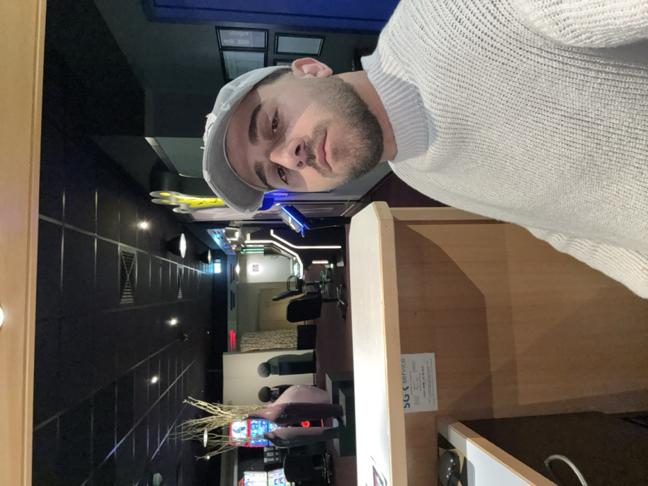 This image depicts an interior scene, identified as an entertainment establishment, likely a gaming arcade or casino, situated within the city of Remscheid, Germany. In the foreground, a male individual, appearing to be in his 20s or 30s, is captured in a selfie perspective. He wears a light grey, ribbed knit mock-neck sweater and a light grey flat cap. He has short facial hair, consistent with a trimmed beard. The individual stands in front of a light-colored wooden reception desk featuring a white countertop. A white rectangular sign labeled "SGK service" with partially visible contact details (phone number and email address) is affixed to the desk's front panel. A dark object, possibly a card reader, is visible on the desk to the left of the sign. The background reveals a dimly lit interior with a dark, possibly black, grid ceiling containing recessed and surface-mounted light fixtures. Behind the reception desk, two large, decorative vases (one dark purple, one lighter purple/pinkish) contain dried branches. Numerous electronic gaming machines with illuminated screens and various colored light elements (white, green, blue) are arranged throughout the carpeted space. Black, wheeled office chairs are positioned in front of several machines. To the right, a dark blue door is visible, flanked by a wall adorned with multiple framed pictures. Abstract, dark-colored decorative elements, resembling sculptures or planters, are visible in the deeper background. No other individuals are present in the scene, and the gaming machines appear to be inactive.
