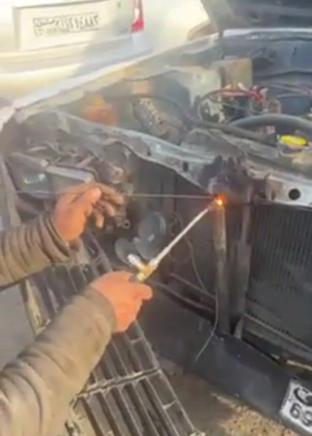 A man is welding the front end of a car with a torch. The car's hood is open and the radiator is visible. The man is wearing a dark jacket and glasses. He is holding a grill in his left hand and the torch in his right. Sparks are flying from the welding torch, and there is smoke in the air. There are other cars parked in the background.