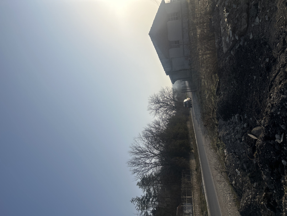 The image depicts a rural or semi-rural roadside scene in Byala, Bulgaria, under a clear, bright sky. The foreground features disturbed earth with piles of dark soil, gravel, and scattered construction debris, including fragments of concrete. A two-lane paved road, dark grey in color, runs from the lower left to the mid-right, curving gently. A light-colored compact SUV or hatchback is observed driving away from the viewer on this road, positioned in the midground. To the left of the road, a low concrete or stone fence borders an area with sparse vegetation and a line of trees, including bare deciduous trees and evergreen pines. To the right of the road, an unkempt area contains dry, reddish-brown brush and several vertical metal posts. Further right, an older, single-story building with a pitched roof and light-colored walls is partially visible, appearing weathered; sunlight glare obscures some details of its windows and structure. The upper portion of the frame is dominated by a clear, light blue sky, transitioning to a bright white haze on the far right, indicative of a low sun. No individuals are present.