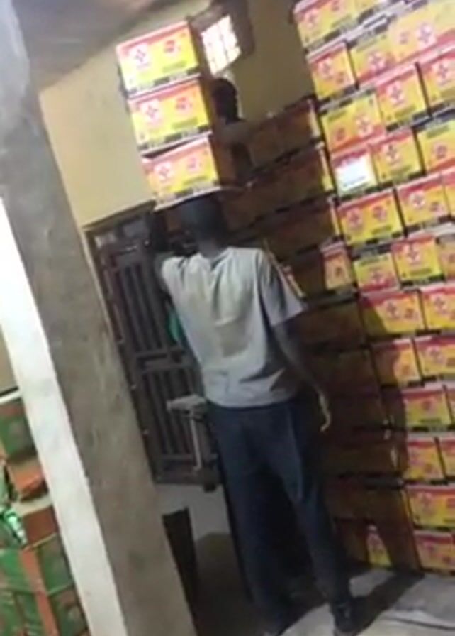 A room with bare concrete floors and pale yellow walls contains stacks of yellow and blue boxes with red and white labels reaching almost to the ceiling. One stack is to the right of the frame, and a smaller one is partially visible to the left. In the center of the frame, two men, one in a grey t-shirt and dark pants, the other in a purple shirt and shorts, are carrying stacks of the boxes. The man in grey is placing boxes on the stack, while the man in purple carries boxes balanced on his shoulder. A third person in a green shirt is also present. A metal-framed window or doorway is visible behind the stacks of boxes. The room is dimly lit.