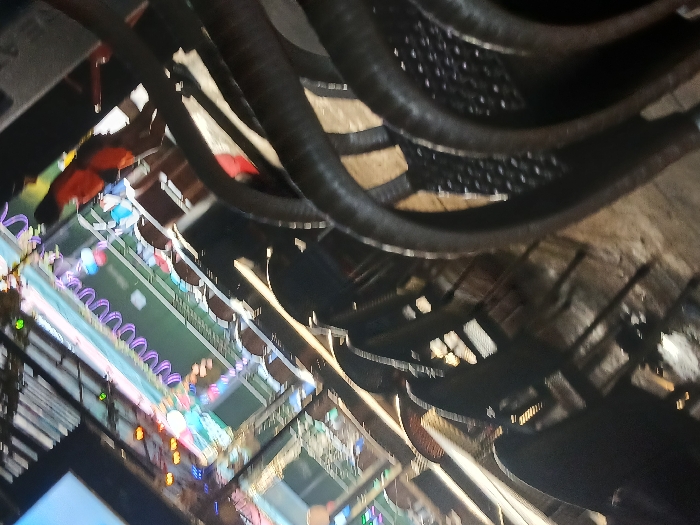 The image depicts an outdoor or semi-outdoor commercial establishment in Al Khobar, Saudi Arabia, captured at a steep diagonal angle. The scene is illuminated by artificial light, suggesting evening or nighttime. In the foreground, a prominent series of dark-colored chairs with curved backs are arranged in rows, appearing to be stacked or closely packed. These chairs feature textured or perforated patterns on their seats and backrests. The ground beneath them is light-colored and indistinct. In the midground, additional rows of similar chairs and tables extend into the background, indicating a seating area for multiple patrons. A single individual is visible in the mid-background, standing among the tables. This person is wearing an orange-colored top and darker lower garments, with their back partially turned towards the camera. The background features extensive decorative lighting. A horizontal segment of wavy purple LED lights is displayed against a green surface, possibly a building facade or a large sign. Below this, various multi-colored lights (including red, blue, yellow, and white) are arranged in patterns, contributing to a vibrant ambiance. A light-colored structural element is partially visible at the far left of the background. No direct interactions are discernible, but the arrangement of seating implies a social or dining environment. The overall environment is one of leisure and public gathering.