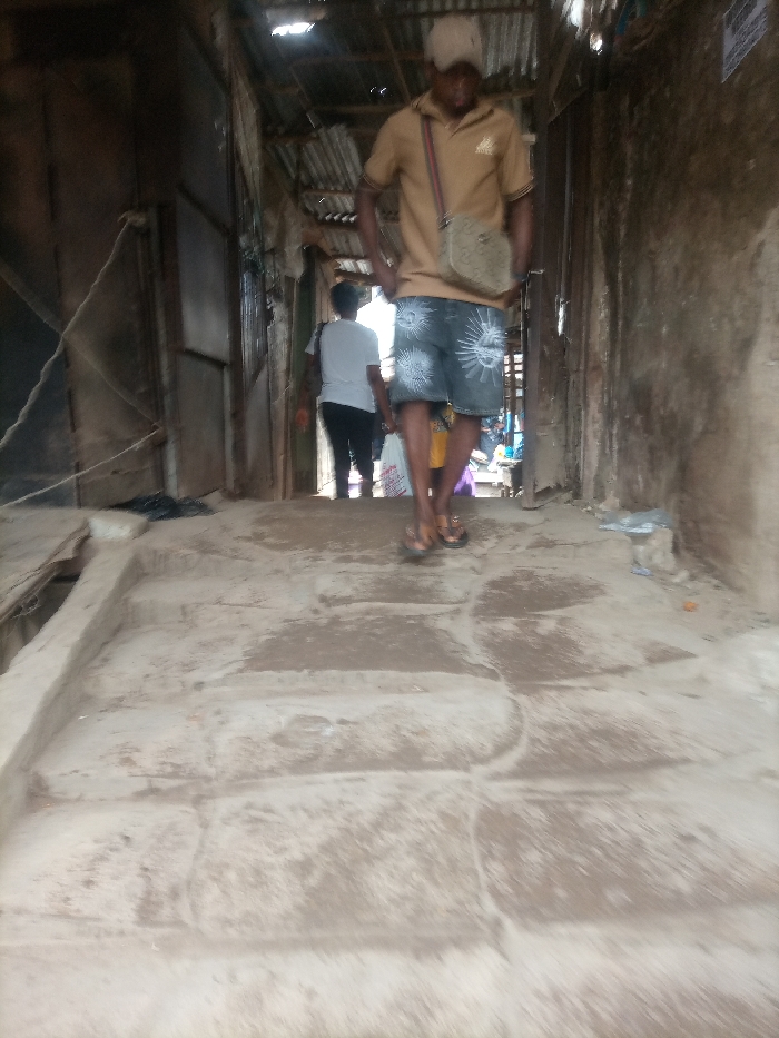 A man wearing a tan shirt, shorts, and a cap walks down steps in a narrow passageway. He has a crossbody bag. Another person walks ahead, further into the corridor. The passageway is flanked by weathered walls and a corrugated metal roof. The steps are concrete and appear worn. The scene suggests an urban or market environment, with hints of activity beyond the passageway's opening.