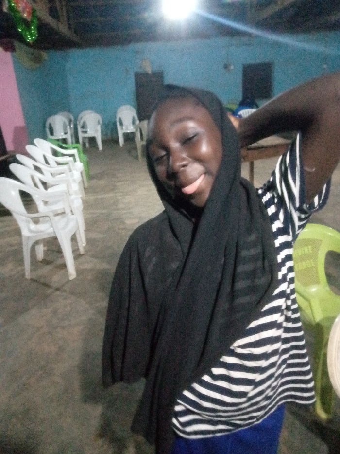 The image depicts an indoor scene in Agban, Nigeria, featuring a single individual in the foreground. This individual, appearing young with dark skin, wears a black head covering, a black and white horizontally striped garment, and blue lower attire. They are shown with eyes closed, tongue extended in a playful gesture, and their right arm raised, hand behind the head. In the mid-ground, multiple rows of white plastic chairs are arranged on a dark, possibly concrete, floor. A few light green plastic chairs are interspersed among the white ones. The walls are painted a light blue color, with a section of pink visible on the far left. The ceiling is dark, and a bright, unshaded light source is visible overhead in the upper-center, illuminating the room. Green decorative material hangs from the upper left side of the room. A dark cabinet or piece of furniture is against the back wall on the right, and a wooden table or bench is partially visible behind the individual on the right.