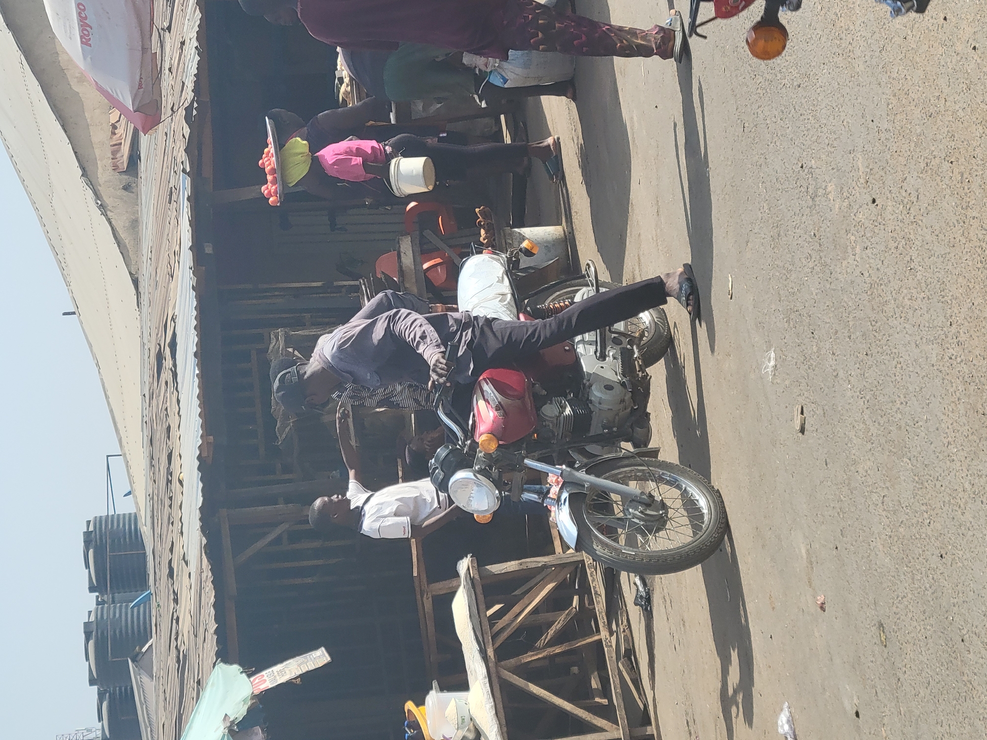 The image depicts an outdoor street scene in Madalla, Nigeria. A red motorcycle is parked on a paved surface next to a wooden structure. A man wearing a button-down shirt and dark pants is reclining across the seat of the motorcycle. Another man wearing a white shirt is standing nearby. In the background, a corrugated metal roof covers a building. Several people are standing in the shadows under the roof. Tires are stacked high.