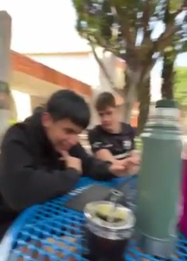 A group of six young people are sitting around a blue picnic table outside on a sunny day. Two are looking at a tablet or phone, while the rest are looking around or at each other. There are several drinking containers and a thermos on the table. Trees and buildings can be seen in the background.