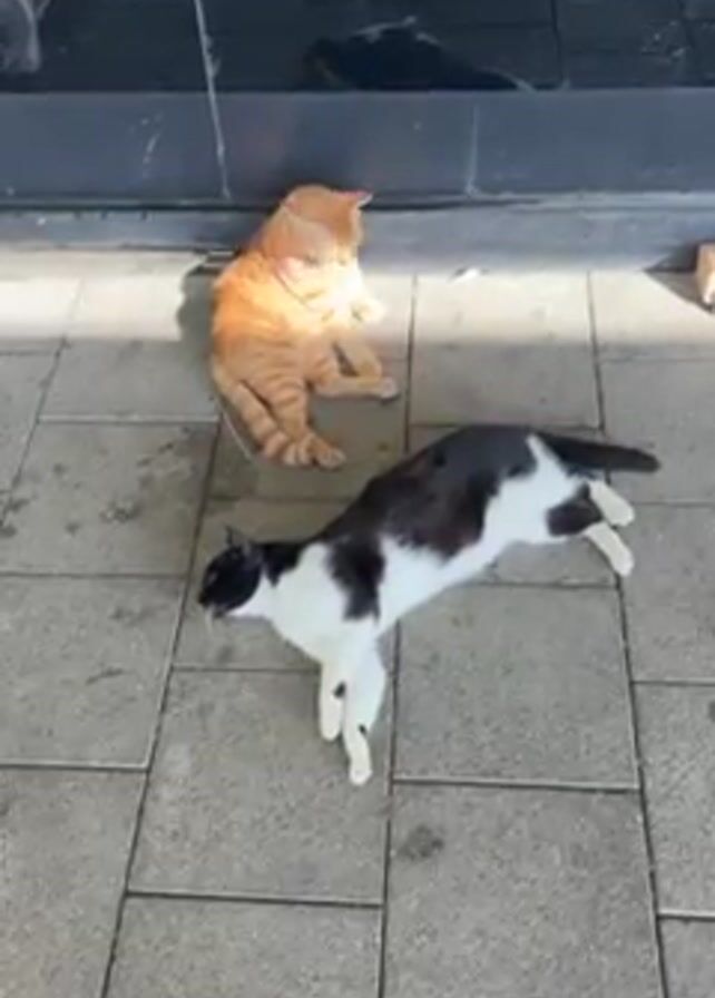 Two cats are lying on a gray tiled surface. One cat is predominantly black and white, lying on its side with its paws extended. The other cat is orange tabby, sitting up. They are both in the sunlight. In the background is a reflective glass surface, with the reflection of a person visible. The scene is outdoors on what appears to be a sidewalk.