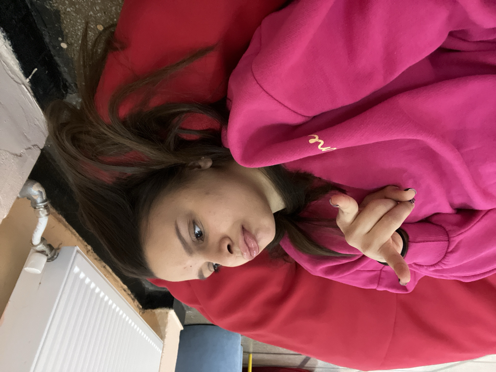 A young woman lies on a red beanbag chair or cushion. She is wearing a bright pink hooded sweatshirt. Her long, dark hair spreads across the cushion near a white radiator. She is making a hand gesture with her right hand. The background includes a black surface, possibly a wall or the edge of a structure. The scene is likely indoors and the location is given as Pernik, Bulgaria, but there are no recognizable indicators of that city present in the image.