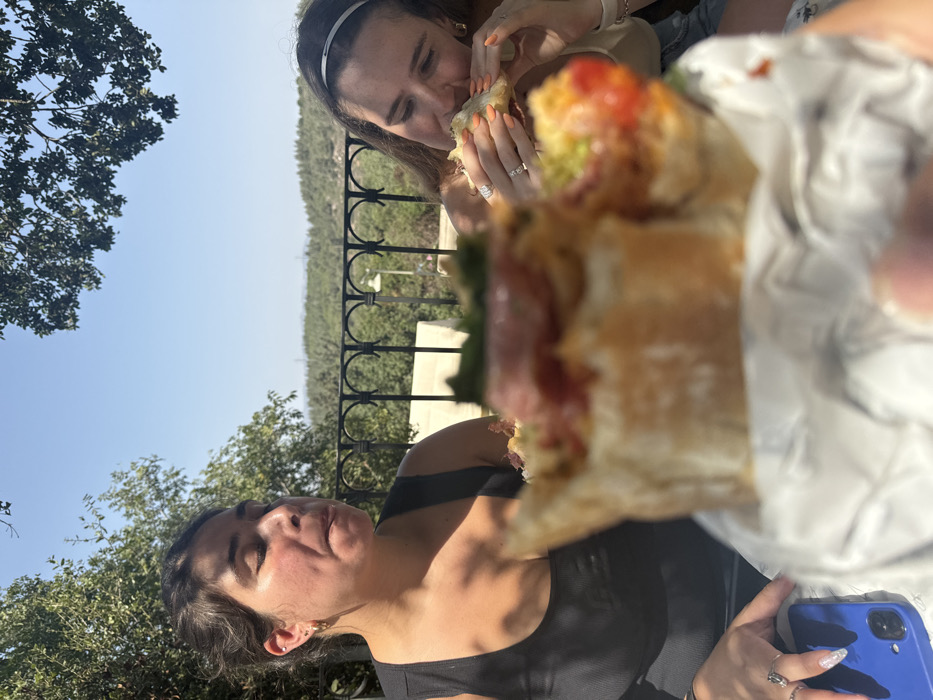The image captures an outdoor daytime scene in Misgav Regional Council, Israel. Two young adult females are seated, engaged in eating large wraps or sandwiches. In the immediate foreground, out of focus, a person's hand holds two large wraps wrapped in white paper, featuring visible fillings like cured meat, greens, and tomatoes. To the left, a female with dark hair, wearing a black tank top, is depicted with her mouth slightly open, suggesting she is chewing or about to eat. Her left hand rests on a blue-cased smartphone. To the right, another female with dark hair and a silver headband is actively biting into a similar wrap, holding it with both hands. Both individuals wear rings and have colored nail polish. The background features a black decorative metal railing. Beyond the railing, a vast, green, hilly, and densely treed landscape extends under a clear blue sky. Portions of a light-colored building and an outdoor lamp post are visible behind the railing. Overhanging green tree branches partially frame the upper corners of the image.