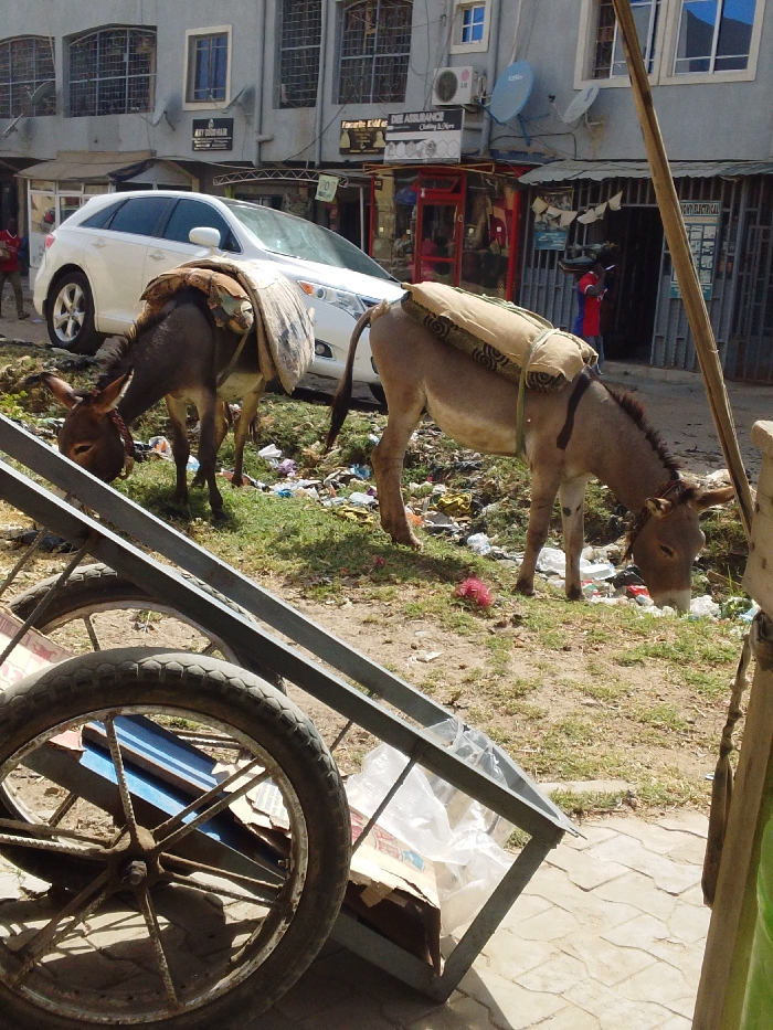 The scene is an urban street in Sabon Gari West, Nigeria, under bright daylight. In the immediate foreground, the metallic frame and two spoked wheels of a handcart are visible on the left, containing cardboard and clear plastic bags. In the mid-ground, two donkeys stand on an unpaved area consisting of dirt and sparse green vegetation heavily interspersed with scattered litter, including plastic bags, styrofoam containers, and wrappers. Both donkeys wear harnesses and are saddled with light-colored, possibly canvas, loads. The donkey on the left is darker brown, with its head lowered towards the ground. The donkey on the right is lighter brown, also with its head lowered, appearing to forage among the refuse. Behind the donkeys, a white Toyota Venza SUV is parked. The background features multi-story concrete buildings housing various commercial establishments. Visible signage includes "ANY BROKER," "Favorite Kiddies Clothing & More," "DUE ASSURANCE," and "V. ENY ELECTRICAL." Satellite dishes and an air conditioning unit are affixed to the building facades. Two individuals are present: one in a red shirt is partially visible on the far left, near the white vehicle, and another person wearing a red top is visible further back on the right, carrying an object on their head near a storefront. Several utility poles are also present, one prominently on the right side of the frame.