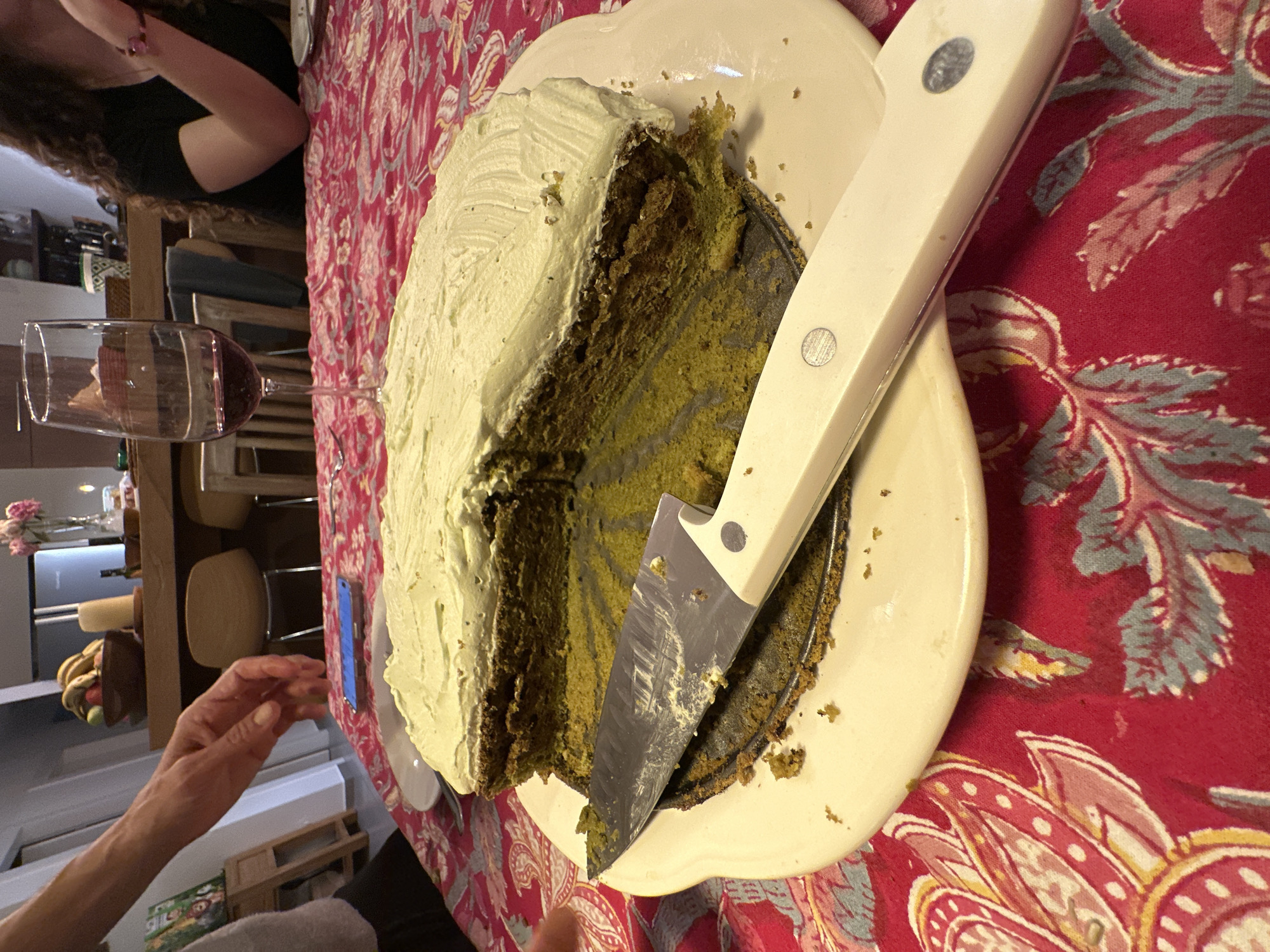 This image depicts an indoor scene in a residential setting in Raanana, Israel, likely a dining area or kitchen. A partially cut, multi-layered cake with a dark green/brownish base and light green/yellowish frosting occupies the center foreground on an off-white oval platter. A large chef's knife with a white handle and silver blade, bearing cake and frosting residue, rests on the platter and the cut section of the cake. The cake and platter are situated on a red tablecloth with a distinct white, pink, yellow, and blue floral/paisley pattern. To the left of the cake, a person's fair-skinned arm and hand are visible, reaching towards the table. A blue smartphone lies face up on the tablecloth behind the cake. Further to the right, a wine glass containing red liquid stands on the tablecloth. To the right, a second person is partially visible, seated, with long, dark, curly hair and a black top. In the background, a kitchen island or counter is present, featuring a wooden bowl with bananas, a cream-colored cylindrical object, and a vase with pink flowers. Wooden chairs and a stainless steel refrigerator are also partially visible in the deeper background. The environment appears domestically lit.