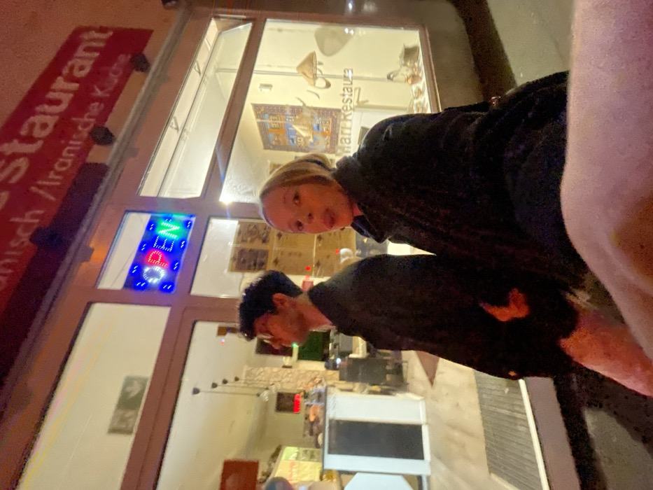 This image depicts two individuals standing on a sidewalk at night in front of the "Tehran Restaurant" (also displaying "Hari Restaurant" on a window decal) on Venloer Str