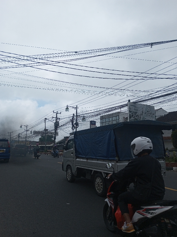 A street scene depicts a road with various vehicles, including a blue car emitting dark smoke, a small truck with a blue tarp, and a red and white motorcycle with a rider in a white helmet. Power lines crisscross the sky above street lights and signage. The sky is overcast, creating a muted atmosphere.