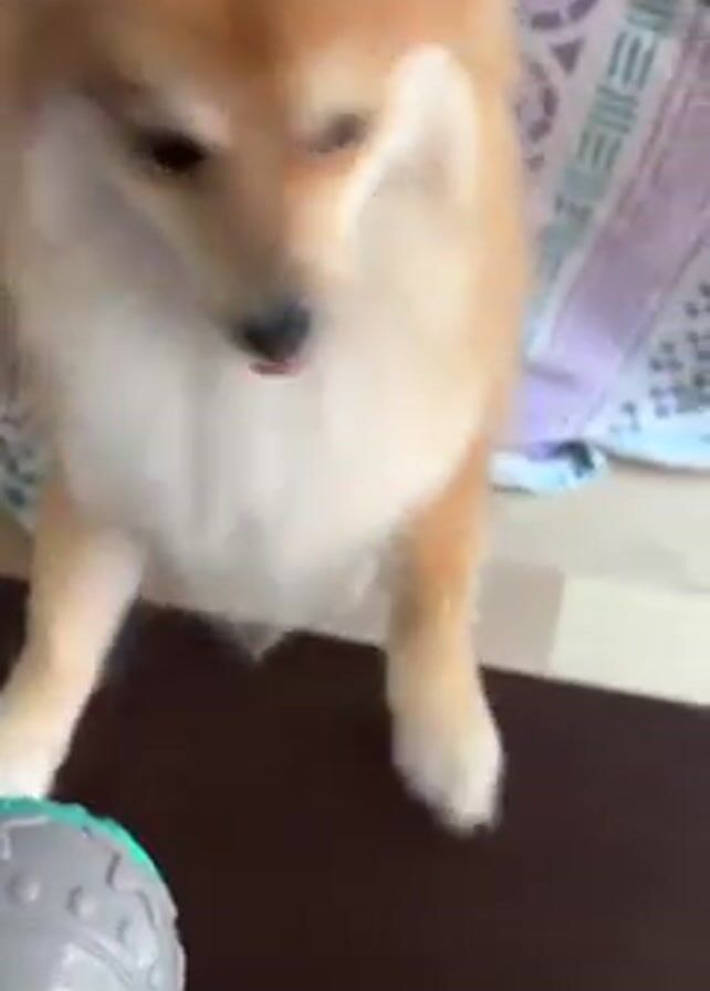 A hand holds a grey ball with green trim out to a medium-sized tan and white dog. The ball makes a high-pitched squeaking noise. The dog starts with its mouth open, then focuses its attention on the ball. The dog appears interested in the ball. A patterned blanket is visible behind the dog and ball. The ball and dog are on or next to a brown surface.