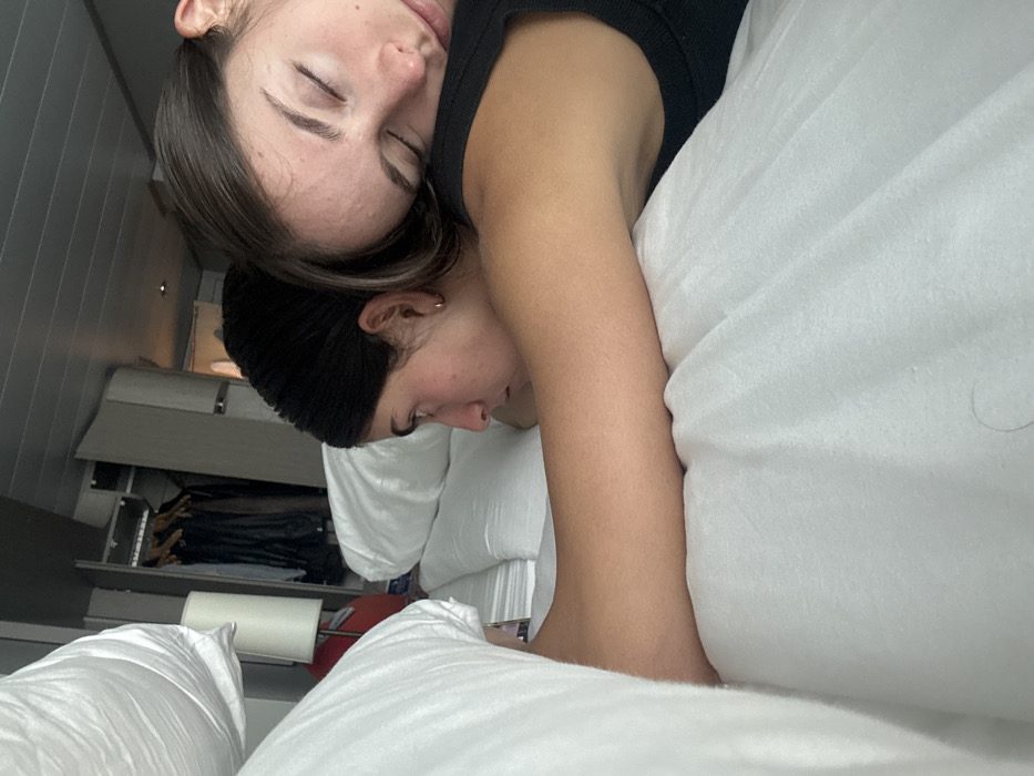 The scene is a cruise ship cabin, identified by its compact design, built-in furniture, and panelled ceiling, currently located at or in transit near San Miguel de Cozumel, Mexico. Two females are depicted lying in a bed with white bedding. The individual on the right is asleep, her eyes closed, with her head resting on the upper back of the individual on the left. She is wearing a dark sleeveless garment. The individual on the left is awake, positioned with her profile facing towards the left side of the frame. She has dark hair pulled back and a small hoop earring in her visible ear. Her right arm extends forward onto the white sheet. In the background, to the left, a white lampshade with a red base is visible next to an open closet containing dark clothing on hangers. A single dark hair strand is present on the white sheet in the foreground.