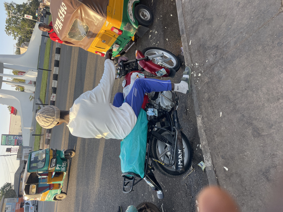 The scene depicts an urban street in Barakin Lerawi, Nigeria, under clear daylight conditions. In the immediate foreground, an adult male with dark skin is seated on a red motorcycle, facing away from the camera. He wears a light-colored ribbed beanie, a white long-sleeved shirt, blue track pants with white vertical stripes, white socks with "HEPA" visible, and grey-green open-toed sandals. His right hand rests on the motorcycle's handlebar. The motorcycle is equipped with a black rear luggage rack, a teal covering over the passenger seat, and "I-MAN" spray-painted in white on its exhaust pipe. Various stickers are affixed to the motorcycle's frame and front fender. The motorcycle is positioned on the asphalt road, adjacent to a concrete curb with scattered white debris. To the right of the motorcycle, a yellow and green Keke Napep (tricycle taxi) with a brown canvas roof is visible, bearing license plate "PTA-614G" on its rear. Standing next to this Keke Napep is an adult male with dark skin, wearing a red polo shirt, looking towards the left side of the frame. In the mid-ground, to the left, a green, yellow, and blue Keke Napep with license plate "PT-1695" is present on the road. The distant background features a large white architectural monument, characteristic of a roundabout, along with utility poles, a green billboard displaying "LIFE," and other vehicles. The scene is brightly illuminated by sunlight, casting distinct shadows.
