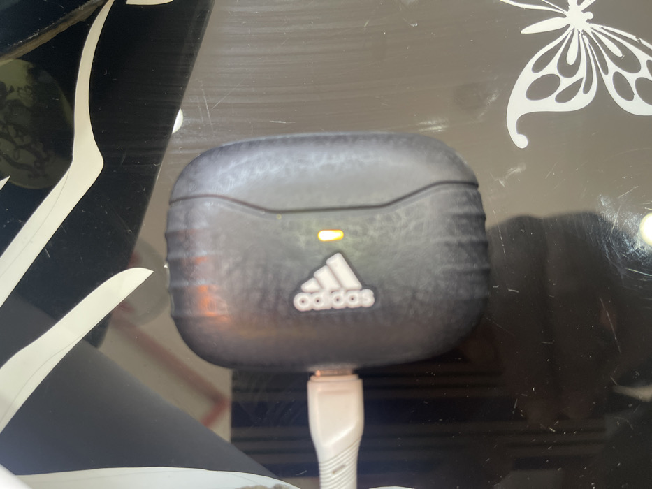 The scene is located in Meknes, Morocco. A dark grey, textured, oblong electronic device case, bearing a white Adidas logo, rests on a reflective dark surface. A single amber indicator light is illuminated on the device, to the right of the logo. A white USB-C cable is connected to the left side of the device. The reflective surface displays numerous scratches and smudges, with a partial white butterfly decal visible in the lower right. Obscured white linear patterns are partially reflected in the upper left background. No individuals are present.