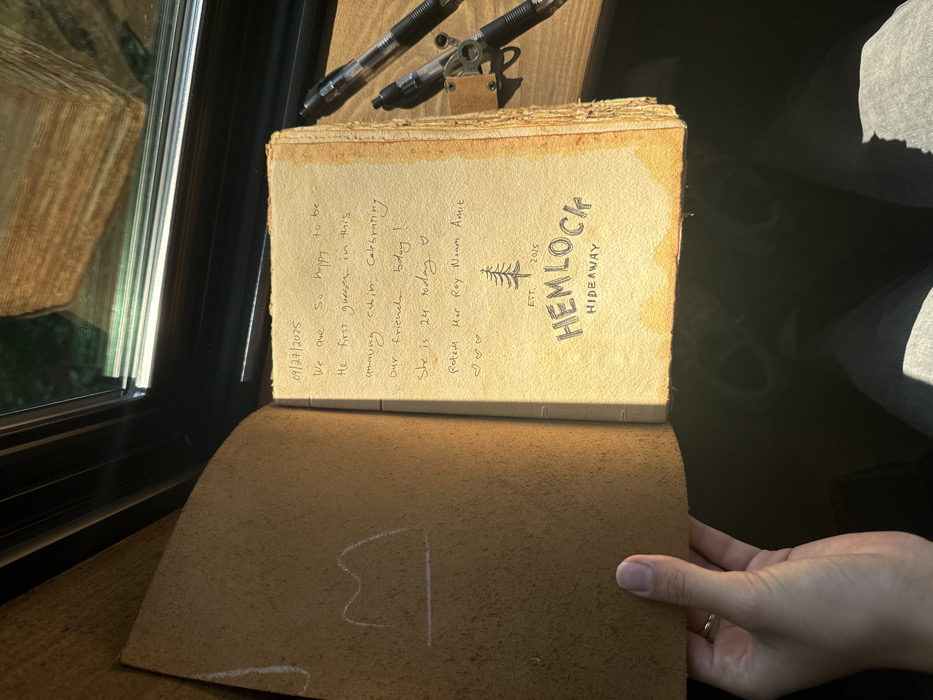 A first-person overhead view captures an open guestbook inside a cabin identified as Hemlock Hideaway, located in Otego, United States