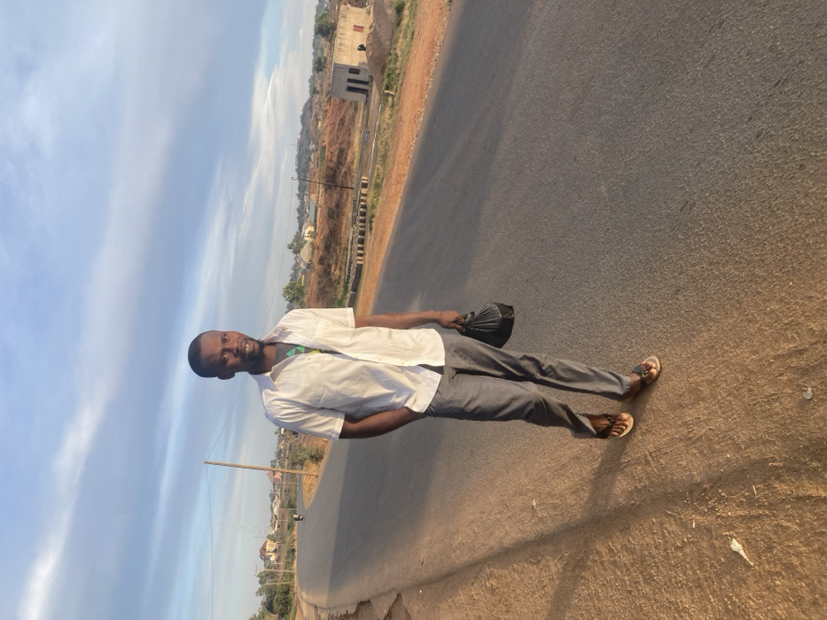 A man stands on a paved road, looking toward the camera. He's wearing a white, short-sleeved button-down shirt, gray pants, and sandals. He is holding a dark object, possibly a hat or bag, in his left hand. The road curves into the distance. In the background, there's a landscape with buildings and vegetation under a partly cloudy sky. The image has a warm, natural light.