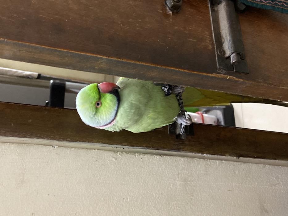 A green Indian Ringneck parakeet clings to a rope perch attached to a wooden structure. The bird has a red beak and a distinctive black ring around its neck, accented by a blue stripe. Its green body and yellow tail feathers are visible. The backdrop is a mix of wood, white wall, and glimpses of objects within the room, creating a sense of enclosure.