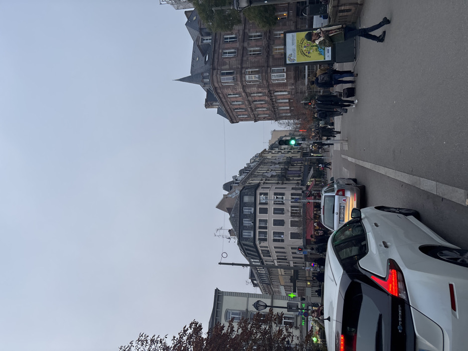 This image depicts an urban street scene in Strasbourg, France, specifically at the intersection of Quai Saint-Jean, Rue du Vieux Marché aux Vins, and Grand'Rue. The perspective looks east along Quai Saint-Jean from a pedestrian area, likely Pont Saint-Nicolas or an adjacent quay. The sky is overcast and pale grey, casting a diffused light over the scene. In the immediate foreground on the left, the rear section of a white Nissan Leaf electric vehicle is visible, facing away from the viewer. Ahead of it, in the same lane, a silver station wagon with French license plate "DS 133 VZ" is stationary. The asphalt road surface shows white lane markings and a pedestrian crossing. A green traffic light for vehicular traffic is illuminated above the intersection, while a red pedestrian signal is visible on a pole to the left. To the left of the intersection, a multi-story building with a light-colored, rounded facade houses a ground-floor pharmacy, indicated by a prominent green cross sign. A deciduous tree with reddish-brown leaves partially obscures the far left. Beyond this, a row of multi-story buildings with traditional European architecture, including pitched roofs and dormer windows, lines the street. Shopfronts with awnings are visible at street level. On the right side of the frame, a distinct reddish-brown multi-story building features multiple bay windows and a dark grey slate roof topped with a small turret or spire. Scaffolding is partially visible on the upper levels of a building situated behind it. A large, vertical outdoor advertising billboard with a colorful graphic design stands on the right sidewalk. Approximately 15-20 pedestrians are present on the sidewalks and crossing areas, dressed in various autumn or winter coats and jackets. Most individuals are walking, while one person on the right sidewalk is observed interacting with a smartphone. Artificial streetlights and building lights are visible, indicating either low natural light conditions or dusk.
