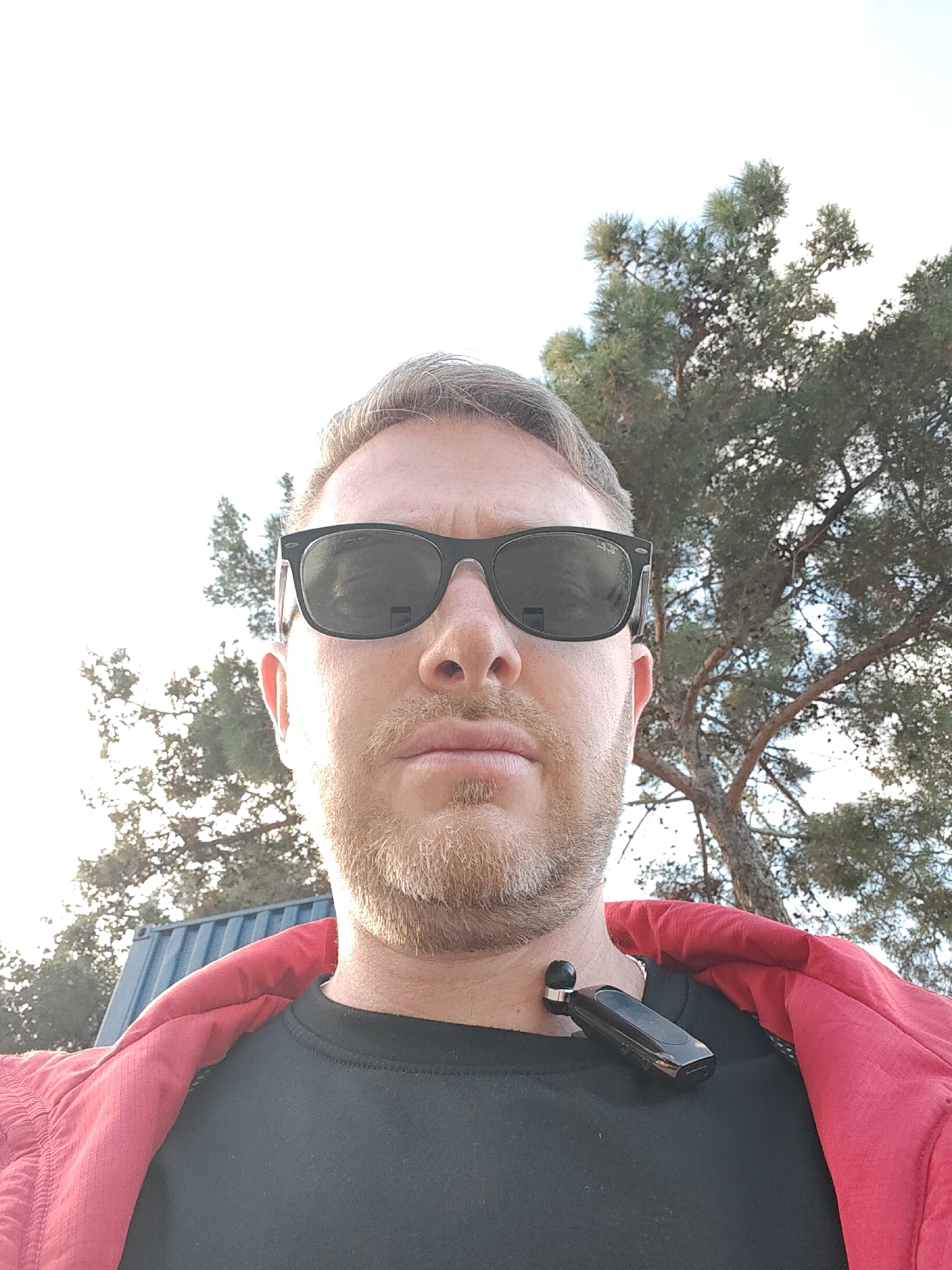 The image displays a close-up, upward-angled selfie of an adult male. The subject is wearing dark, rectangular-frame sunglasses, obscuring his eyes. He has short, light-colored hair and a trimmed light-colored beard and mustache. He is dressed in a black crew-neck t-shirt, with a red, possibly padded, jacket draped over his shoulders. A black, elongated Bluetooth earpiece with a small earbud is clipped to his t-shirt collar on the right side of his neck. The background consists primarily of a bright, light-colored sky, with several dark green, needle-leafed trees, consistent with pine species, visible below. In the lower left background, a section of a blue-green corrugated metal structure, resembling a shipping container or building roof, is partially visible. The scene is illuminated by natural daylight. While the image is situated in Haifa, Israel, the visual elements present do not provide sufficient detail to pinpoint a precise location or specific landmark within the city; the environment suggests an outdoor area with natural vegetation adjacent to a utilitarian man-made structure.