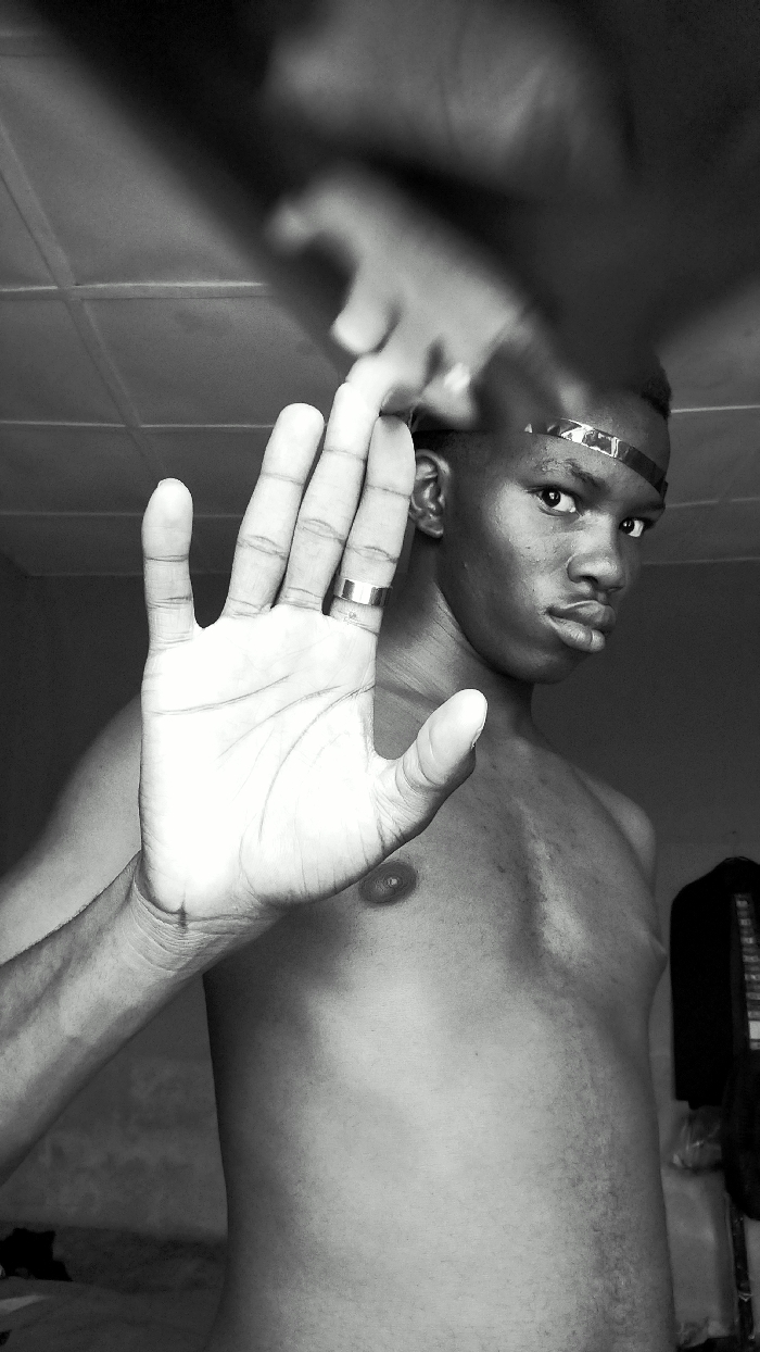 The monochromatic image portrays a young adult male situated indoors in Keffi, Nigeria. He is depicted from the mid-chest up, shirtless, with his right hand raised vertically, palm facing the viewer, fingers extended in a gesture commonly associated with "stop" or "halt." A plain band-style ring is visible on the ring finger of his raised hand. Across his forehead, a reflective, band-like material is affixed. The subject's dark complexion is evident, and he maintains direct eye contact with the camera, exhibiting a serious expression with slightly pursed lips. In the upper background, a blurred, out-of-focus human hand or arm is visible, positioned above and behind the subject's head, near his left ear. The immediate background appears dark and indistinct, while the upper left corner reveals a ceiling with visible panel lines.
