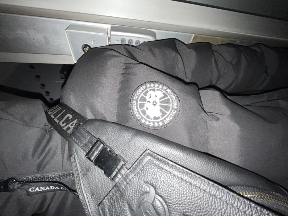 A black Canada Goose jacket with the Arctic Program emblem is partially visible under an overhead compartment