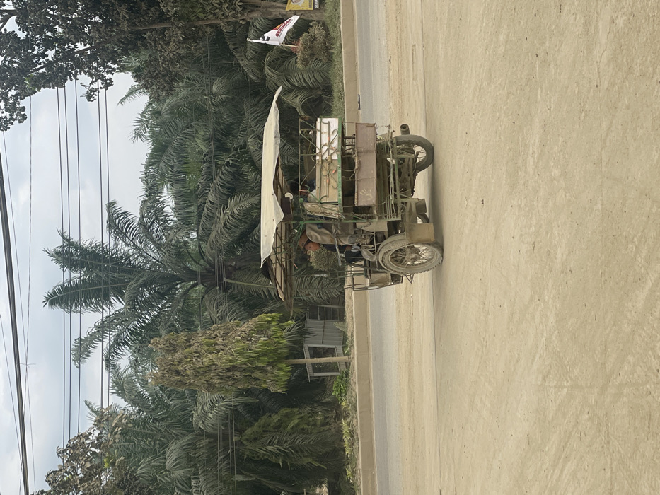 A three-wheeled vehicle traverses a dusty road, its weathered frame and canopy suggesting age and frequent use. Lush palm trees and other greenery line the roadside, contrasting with the arid appearance of the road. Overhead power lines stretch across the sky, adding to the scene's dynamic. A political banner is also visible in the background. The vehicle's construction appears functional and basic, possibly locally assembled.
