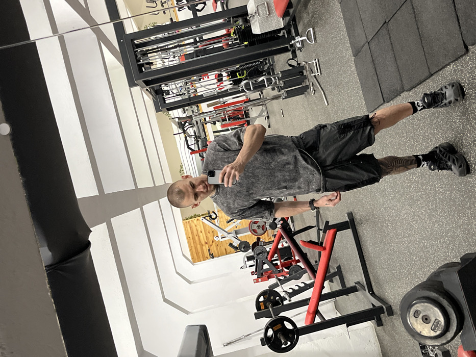 The image depicts a male individual taking a mirror selfie inside an indoor gym facility in Sapareva Banya, Bulgaria