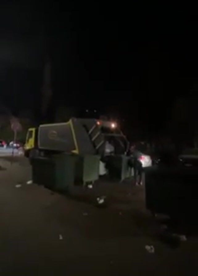 garbage truck emptying bins at night. The truck is yellow and gray. There are several people standing near the bins. The camera pans to show a man in a black jacket looking at the camera. Another man is behind him. The environment is dark, with some streetlights visible.