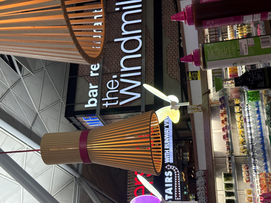 The image depicts an indoor commercial environment within London Stansted Airport, Uttlesford, United Kingdom. In the immediate foreground, two illuminated pendant light fixtures, constructed from vertical wooden slats, hang from a high, tessellated ceiling structure. The left fixture features a fuchsia band around its top and a visible red suspension cord. Below these, multiple condiment bottles are visible on a surface, including two large squeeze bottles with prominent pink caps and a dark liquid bottle with a green funnel inserted into its neck. In the mid-ground, a brightly lit, multi-tiered refrigerated retail display unit is present, stocked with various pre-packaged food items such as salads, fruit pots, and bottled beverages including water and juices. Above this unit, a partial sign reads "STAIRS WITH RUNWAY VIEW" and an illuminated decorative element resembling a propeller is visible. The background features a large, illuminated sign with white letters spelling "bar restaurant the Windmill," mounted on a structure with a red brick-patterned facade. No individuals or active interactions are visible.