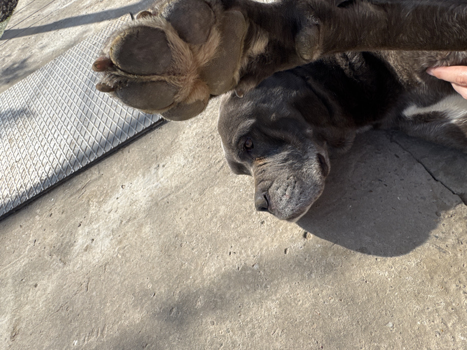 The image depicts a large, dark-grey dog, possibly a Cane Corso or similar mastiff breed, positioned on a light-grey concrete surface