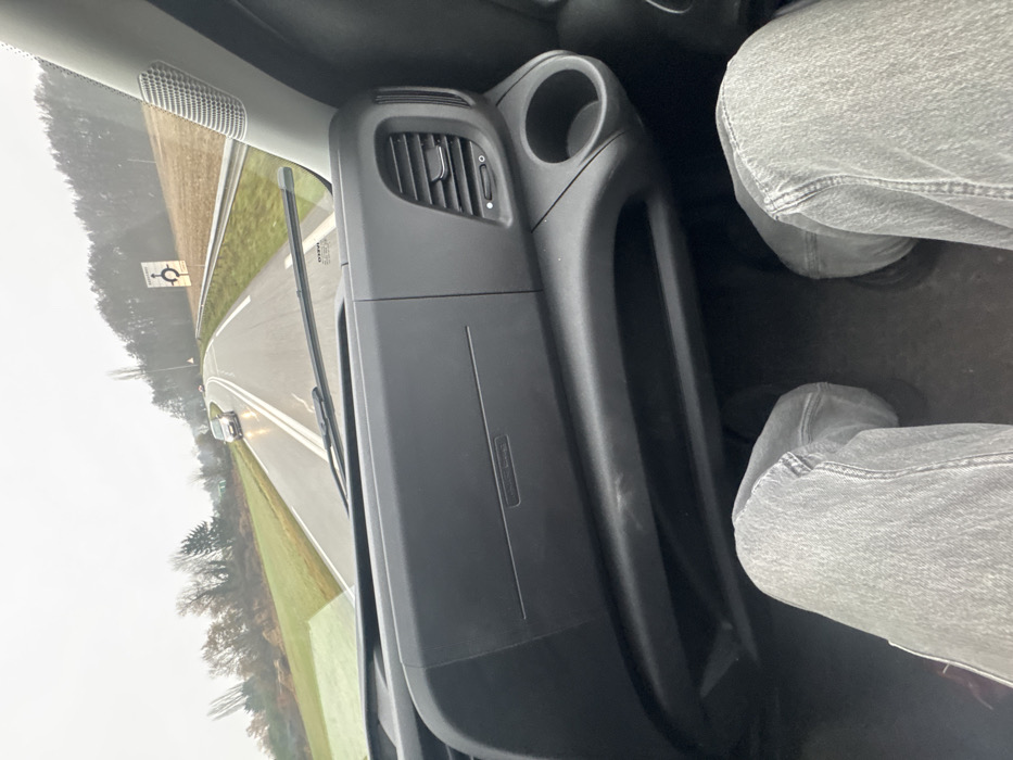 The scene is observed from the interior passenger seat of a vehicle traveling on a wet two-lane road in the vicinity of Haguenau, France, under an overcast sky. The lower portion of the image displays the passenger's legs, dressed in light grey denim jeans and dark footwear, positioned within the footwell. The vehicle's dark dashboard occupies the mid-ground, featuring a passenger airbag panel inscribed with "AIRBAG," a right-side air vent, and an integrated circular cup holder. Through the windshield, the asphalt road, slick with moisture, extends forward and curves gently to the right. A silver-colored sedan with activated headlights is visible ahead on the road. Roadside features include grassy embankments and a metal crash barrier on the right. A prominent white rectangular sign on the right verge indicates "Haguenau" and an upcoming roundabout, with "PRE-SIGNALISATION PROCHAINE SORTIE" printed above the roundabout symbol. The distant landscape comprises dense trees and foliage beneath a grey, cloudy sky.