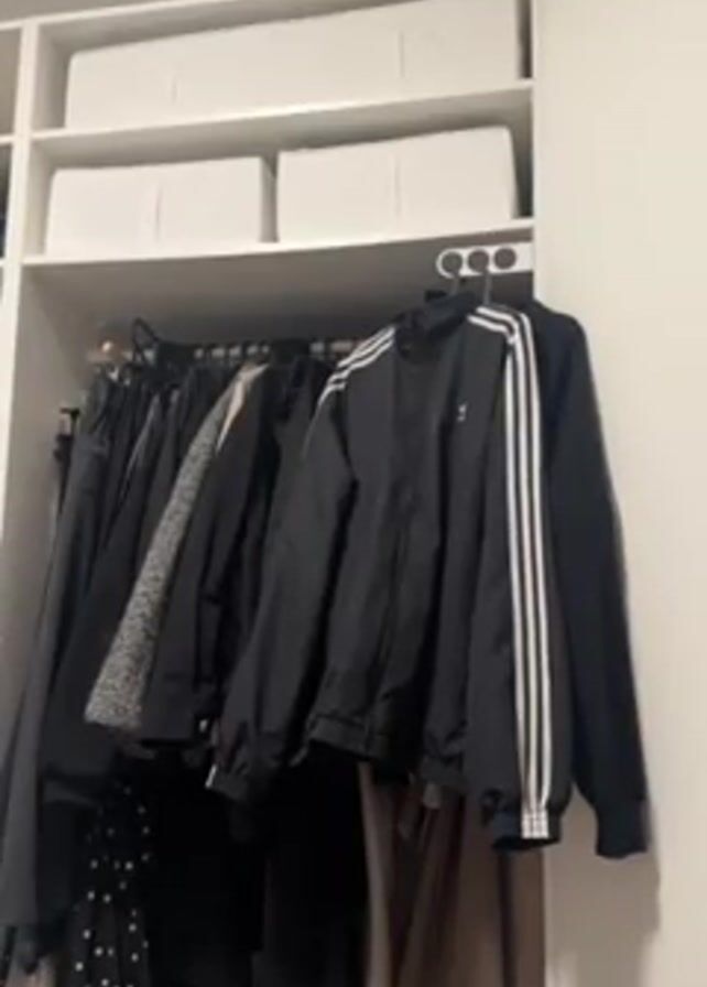 A white closet is shown, with two shelves on top holding three white boxes. Below the shelves is a hanging rod filled with clothes. A black Adidas jacket with three white stripes hangs on the right end of the rod. Other clothing items such as a gray jacket, polka dot dress, and black and brown pants are visible.
