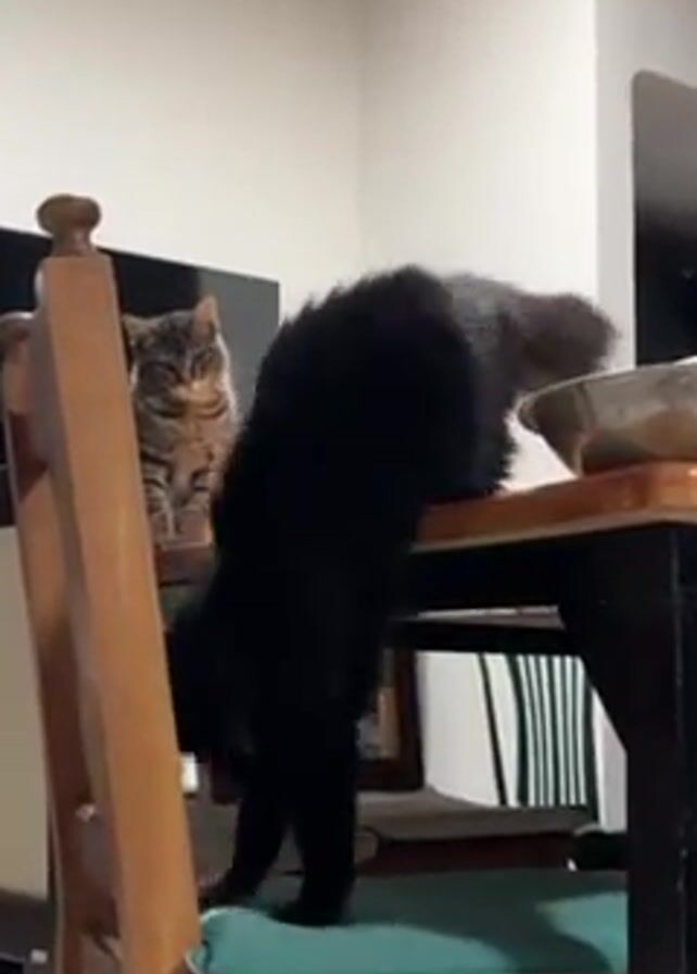 Here’s a description of the video: The video shows two cats on and around a dining room table and chairs. One cat is a black, long-haired cat, and the other is a brown tabby. The tabby cat is sitting still on the seat of a wooden chair pulled up to the table. The black cat jumps from the edge of the table down onto the seat of the same chair, facing away from the tabby. The tabby watches. The dining room is well-lit, with a dark colored table and chairs. In the background, a television screen can be seen mounted on the wall. There is also a stainless steel bowl on the table.