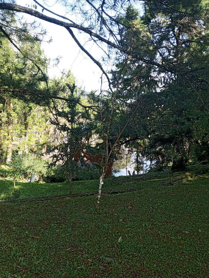 A serene scene unfolds with lush green foliage dominating the foreground. The land gently slopes towards a tranquil body of water, partially obscured by trees. A slender, nearly bare tree stands prominently in the midground. Overhead, branches intertwine, filtering sunlight and creating dappled shadows. The overall impression is one of peaceful natural beauty.