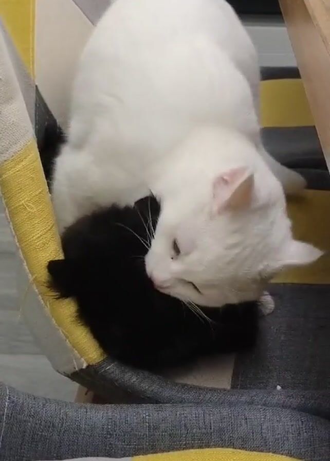 A short video shows a white cat sitting on top of a black cat in a chair. The chair is upholstered with a striped fabric. The white cat grooms the black cat’s head with its tongue. The black cat remains still during the grooming.