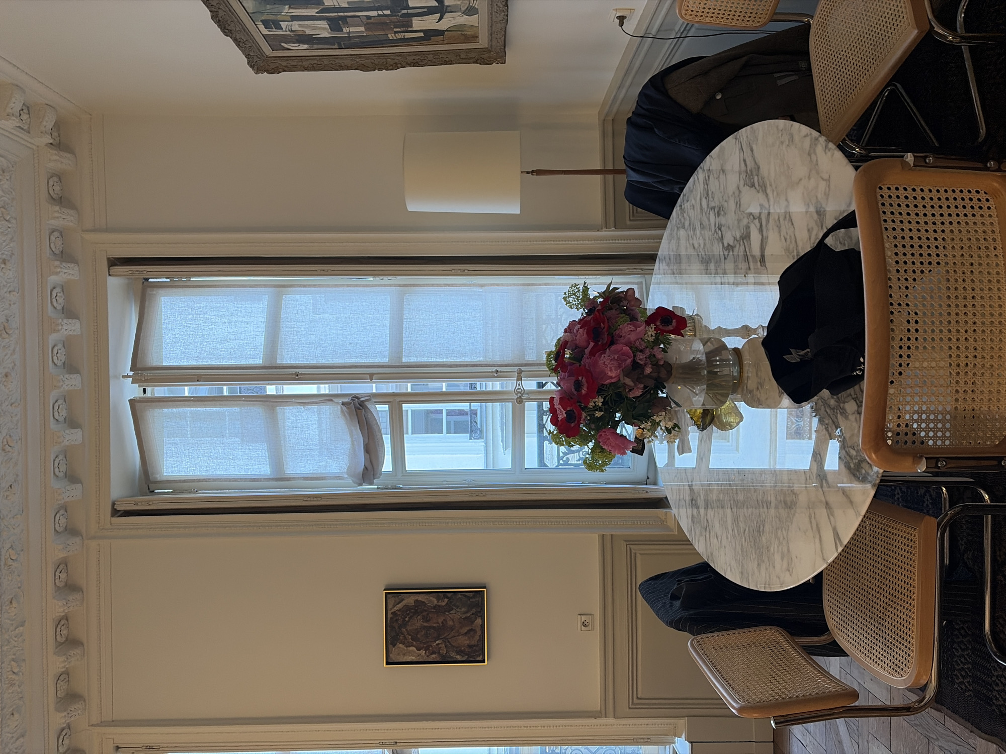 The image displays an interior room, likely a dining or living area, within a Haussmannian-style apartment in the city of Paris, France. The room features high ceilings with ornate white plaster cornice molding and light-colored walls, which include decorative paneling along the lower sections. A large, oval table with a polished white marble top is centrally positioned, reflecting ambient light. On the table, a clear glass vase contains a vibrant bouquet of flowers, predominantly red anemones, pink peonies, and green foliage. A black bag rests on the table's surface near the vase. Around the table are at least four chairs, each featuring caned seats and backs supported by chrome frames. A dark blue pinstripe jacket is draped over a chair on the left, and a dark, solid-colored jacket hangs over a chair to the right. In the background, a tall, double-panel window, partially open inwards, is fitted with white sheer Roman blinds that obscure most of the exterior view but reveal glimpses of typical Parisian building facades beyond. To the left of the window, a gold-framed portrait-style artwork is mounted on the wall, with a white European electrical outlet visible below it. To the right, a tall, freestanding lamp with a white cylindrical shade is positioned, and further right, a large, elaborately framed abstract painting hangs on the wall. A dark, patterned rug lies beneath the table and chairs, with a herringbone parquet floor visible around its perimeter. No individuals are present in the scene.