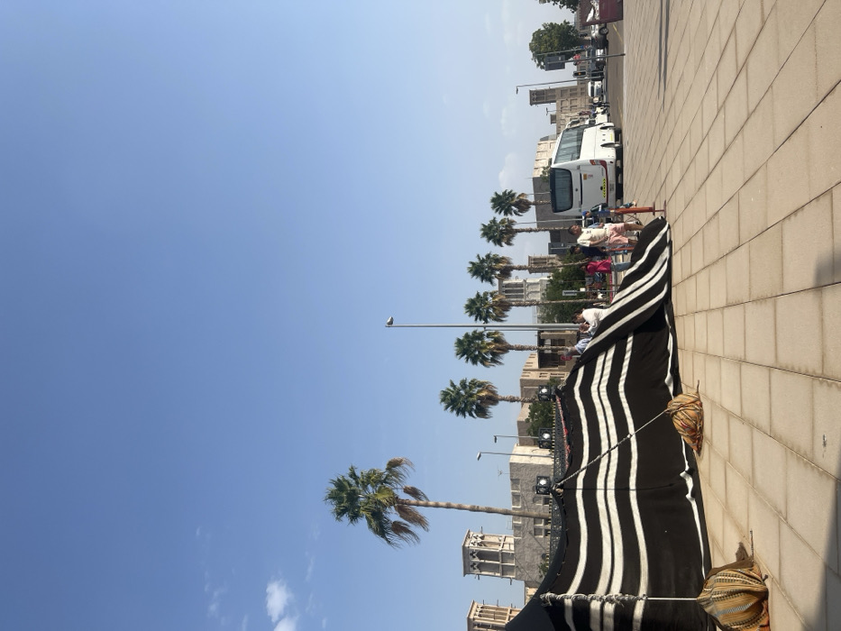The scene depicts an outdoor urban environment within Deira, United Arab Emirates, under a clear blue sky with minimal cloud cover. In the foreground, a large, low-lying tent or canopy structure is visible, constructed from black fabric with prominent horizontal white stripes. This structure is secured to the light-colored paved ground by two distinct, decorative, possibly weighted objects, one on the left and one centrally located. In the midground, several individuals are present. Multiple people, including men and women in casual attire (e.g., shorts, t-shirts), are standing near the tent's edge and further back, observing the surroundings. A white passenger bus (coach) is positioned on a paved roadway to the right, facing away from the viewer. A tall, light-grey street light pole stands prominently in the center-right. The background features a row of mature palm trees with green fronds and visible trunks, lining a street. Behind the palm trees and further back are several traditional-style buildings constructed from light-colored materials, characterized by distinct square wind towers (Barjeel) on their rooftops. Additional structures, vehicles, and street infrastructure are visible in the far background. The overall impression is a sunny day in an area blending historical architecture with modern urban elements.