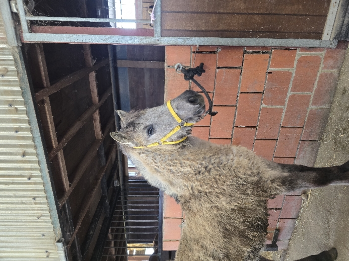 An equine subject, possibly a pony or foal, stands in what appears to be a stable or barn in Tournai, Belgium