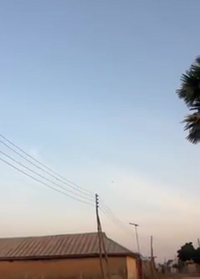 landscape in what appears to be a rural area. The sky is clear and blue with hints of pastel colors near the horizon, suggesting dawn or dusk. A building with a corrugated metal roof is visible in the foreground, and electrical wires run along wooden poles beside the building. There is a dirt road or path. Vegetation is sparse with dry grass and scattered trees. A palm tree stands out on the right-hand side of the frame. Several birds fly across the sky at one point.