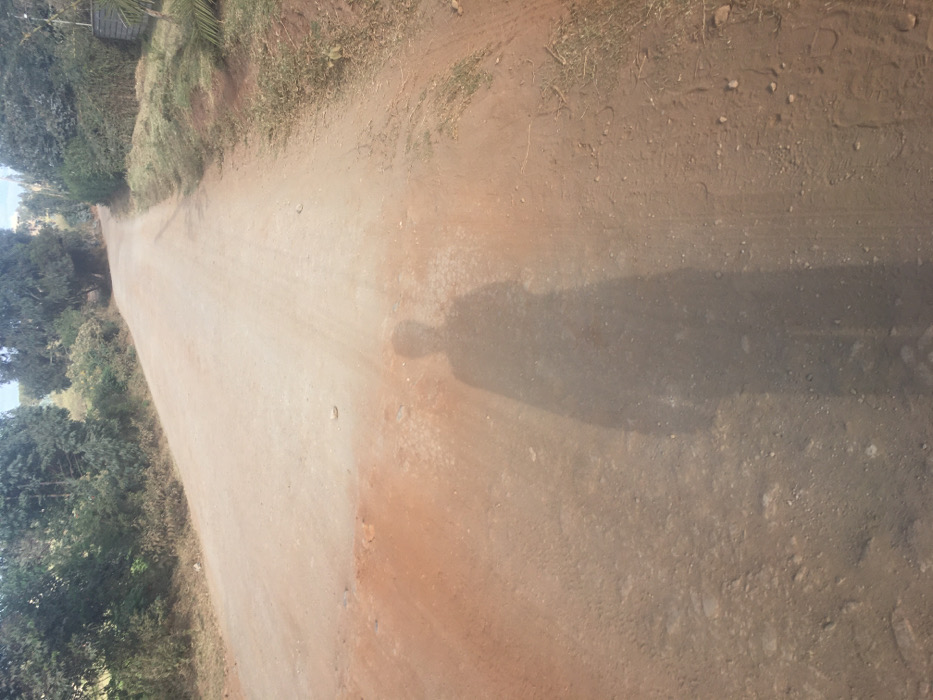 The image depicts a dirt road in Ndeiya, Kenya, under clear daylight conditions. A long, dark shadow of a standing individual, presumed to be the photographer, is cast prominently across the foreground of the road, extending towards the viewer. The road surface is predominantly light brown and uneven, composed of packed earth with scattered small stones and patches of reddish-brown soil. It stretches into the distance, appearing to curve slightly to the right. Both sides of the road are bordered by a mix of green grass, shrubs, and trees, forming dense vegetation that continues into the background.