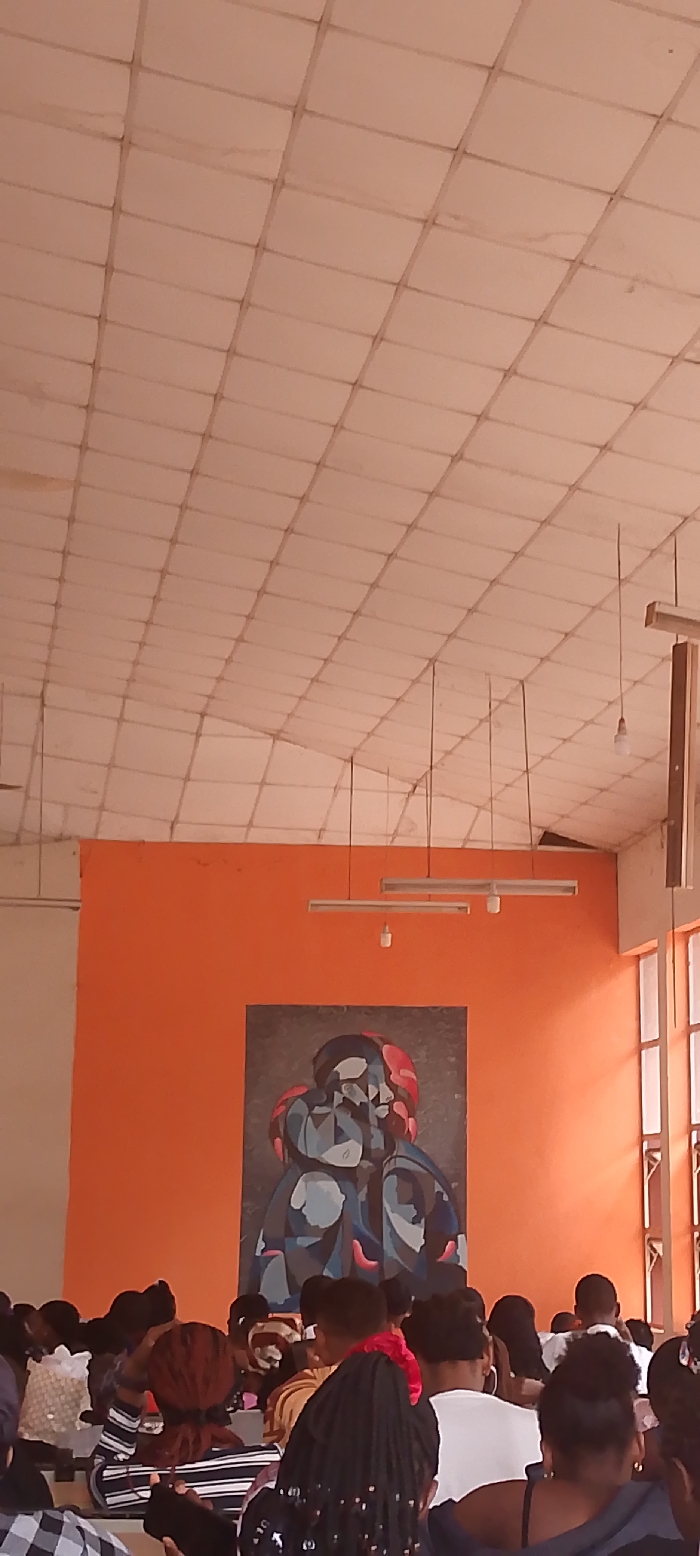 The image depicts a crowded indoor public space in Nsukka, Nigeria, likely a lecture hall or auditorium within an educational institution such as the University of Nigeria, Nsukka. Numerous individuals, primarily young adults, are seated and positioned with their backs to the viewer, facing towards the front of the room. The upper half of the frame reveals a light-colored, tiled ceiling exhibiting discoloration and visible grid lines. Suspended from the ceiling are several thin wires or rods, two horizontal fluorescent light fixtures, and a single bare incandescent bulb. The front wall of the room is painted a vibrant orange, with a lighter section visible to the left. Centered on the orange wall is a large rectangular painting featuring abstract, geometrically fragmented figures, primarily in shades of blue, gray, and red, depicting what appears to be two intertwined or embracing subjects. To the far right, vertical window frames allow natural sunlight to penetrate, casting diagonal light patterns onto the orange wall. Attendees are dressed in casual attire, with various hairstyles visible. No specific actions or interactions are discernible beyond the collective presence and forward orientation of the group.