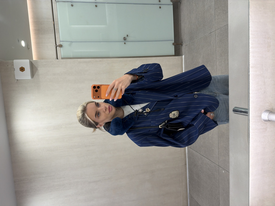 The image displays a mirror reflection of a female subject taking a selfie inside an indoor facility in Sant Josep de sa Talaia, Spain. The subject, with blonde hair pulled back, is seen wearing an oversized dark blue pinstripe blazer adorned with multiple decorative brooches, a white top, light blue jeans, and a navy blue plush neck pillow or collar. A black shoulder bag with gold-toned hardware hangs from her left shoulder. She holds an orange-cased smartphone in her right hand, angled towards the mirror, with her gaze directed at the device. The environment features light beige, vertically textured walls and a light grey tiled floor. In the background, two frosted glass partitions with silver handles and hinges are visible, indicative of restroom stalls. A white rectangular wall-mounted unit with a hexagonal emblem and overhead lighting fixtures are situated on the upper wall. A chrome faucet is partially visible in the bottom foreground, suggesting a sink area.