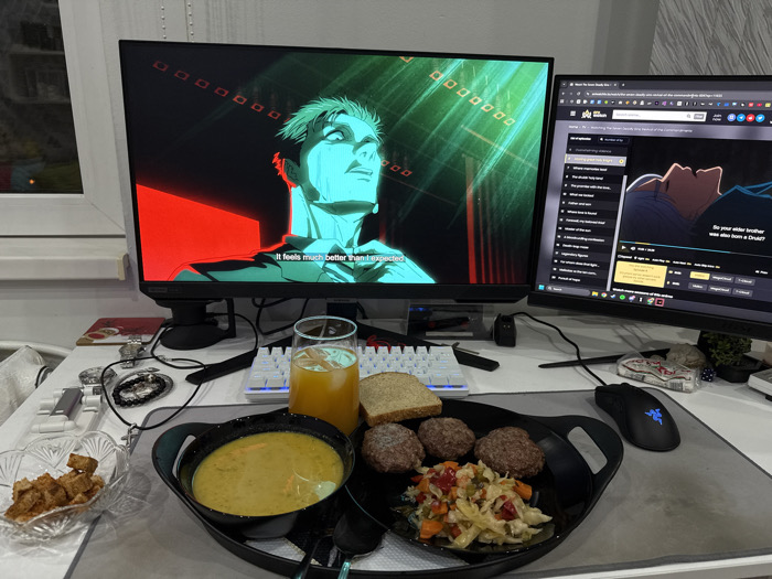 This image captures a domestic scene within a residence in Plovdiv, Bulgaria, featuring a desk setup with a meal. The primary focus is a black serving tray holding a meal positioned in front of two computer monitors. The left monitor displays an anime scene with a prominent male character rendered in green/blue hues against a red and black background, featuring the subtitle "It feels much better than I expec". The right monitor displays a web browser interface, specifically YouTube, playing video content (likely anime or a show) with the subtitle "So your elder brother was also born a Druid?". A video playlist is visible on the left side of this screen. The meal on the black tray consists of a black bowl of yellow soup or stew containing visible vegetables, four round brown patties (likely koftas or meatballs), and a portion of chopped, mixed vegetables appearing to be a salad or pickled medley. Two slices of bread, one whole and one partially obscured, are present. A tall glass of orange liquid, consistent with orange juice, stands to the right of the soup bowl. To the left of the tray, a small, clear, ornate glass dish contains golden-brown croutons or fried bread pieces. The desk surface is white. A white mechanical keyboard is positioned between the food and the monitors. A black gaming mouse with a glowing blue emblem (Razer brand) rests on a grey mouse pad to the right of the tray. Various personal items are scattered on the desk, including a cross pendant on a black cord, a watch, a bracelet, a small metallic object (possibly a lighter), a small plant in a pot, a red coaster, and a small packet labeled "XPL". Cables are visible connecting the devices. A white-framed window is partially visible on the far left, revealing a blurry, dark background with a distant light source, suggesting an evening or nighttime setting.