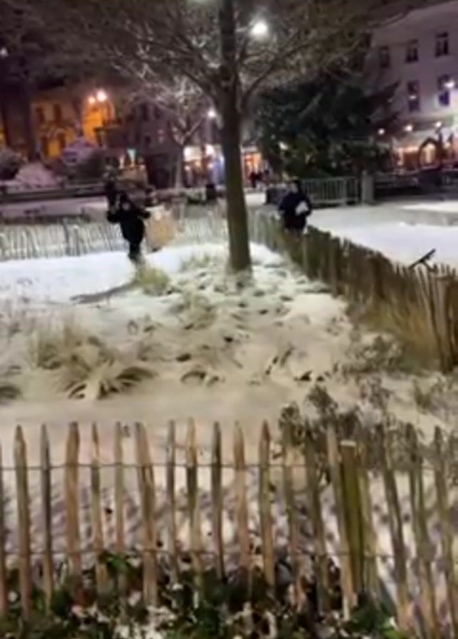 Two children are having a snowball fight in a snow-covered town square at night