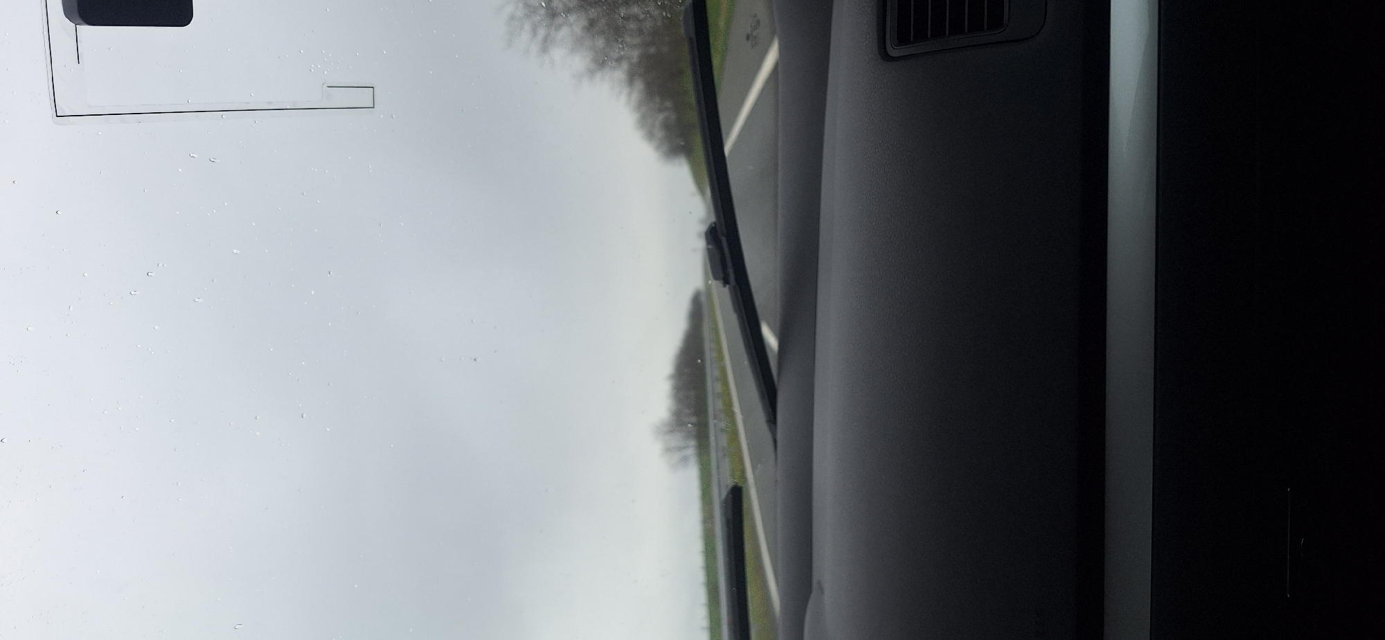 A view from inside a car, showing a highway landscape. The sky is overcast and gray, with water droplets visible on the windshield. Trees line the roadside. The car's dashboard is dark, with interior elements like an air vent and trim visible. The location is not clearly discernible as Zheleznik, Bulgaria, from the image alone.