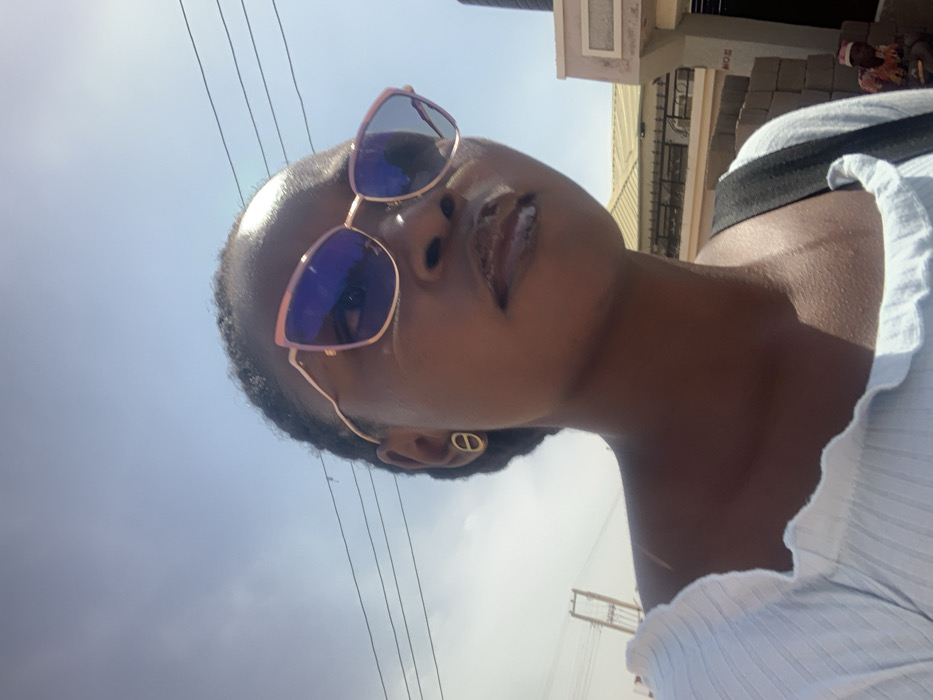 A young individual with a dark complexion, wearing pink-framed cat-eye sunglasses with reflective blue lenses and a light blue ruffled off-the-shoulder top, is depicted in a low-angle close-up