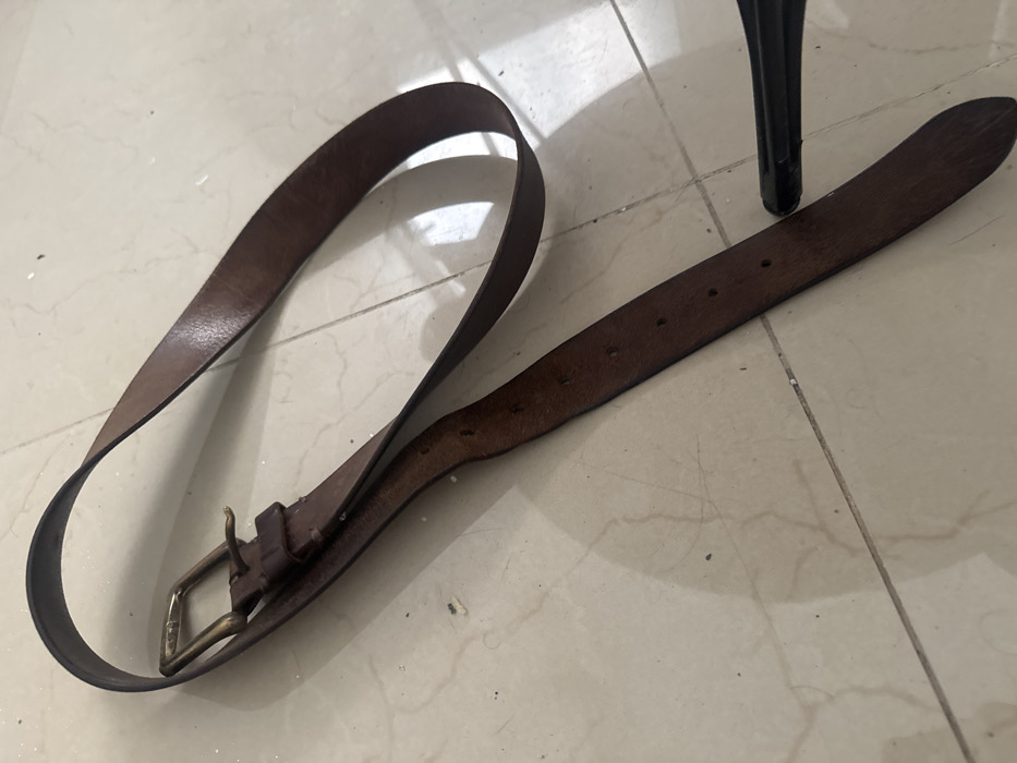 - "The scene depicts a dark brown leather belt, featuring a brass-toned rectangular buckle with a single prong, lying curled on a light beige or off-white tiled floor" by FM-R3Pxn2, licensed under CC BY 4.0